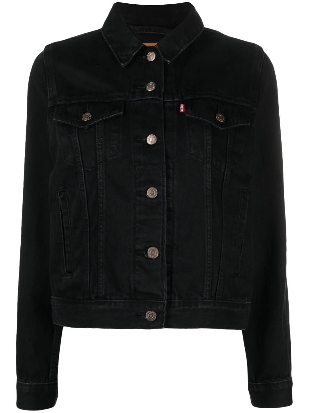 trucker denim jacket Highlights - Black - Cotton - Dark wash - Classic collar - Front button fastening - Long sleeves - Buttoned cuffs - Two chest flap pockets - Two side slit pockets - Straight hem Imported Composition Cotton 100% SIZE & FIT Measurement BUST 38.58 in(98 cm) LENGTH 21.65 in(55 cm) WAIST 37.79 in(96 cm) SLEEVE LENGTH 22.44 in(57 cm) Shoulder Width 17.71 in(45 cm)