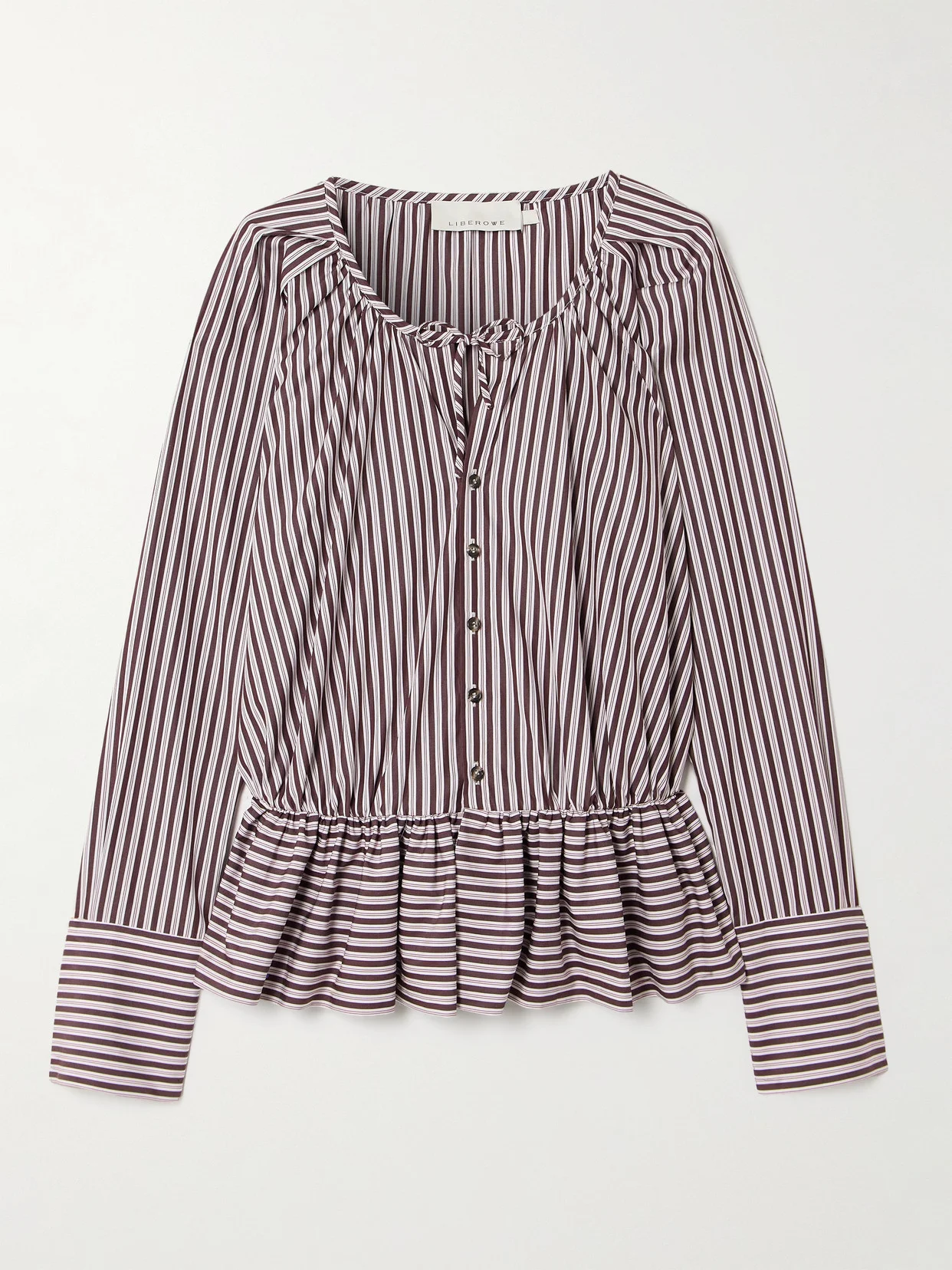 EXCLUSIVE AT NET-A-PORTER. This season, LIBEROWE extends its love of peplum shapes to include this vintage-inspired blouse. It's cut from airy cotton-poplin and has stripes that trace the body, sleeves and cuffs. Adjust the ties to experiment with different necklines. Responsible Craftsmanship. This product promotes artisanal skill and brands that invest in communities and adhere to fair-trade principles. Find out more about our NET SUSTAIN criteria here. Designed for Circularity. This product promotes lasting style and reduces waste by enhancing longevity, reuse or end-of-life solutions. Find out more about our NET SUSTAIN criteria here.