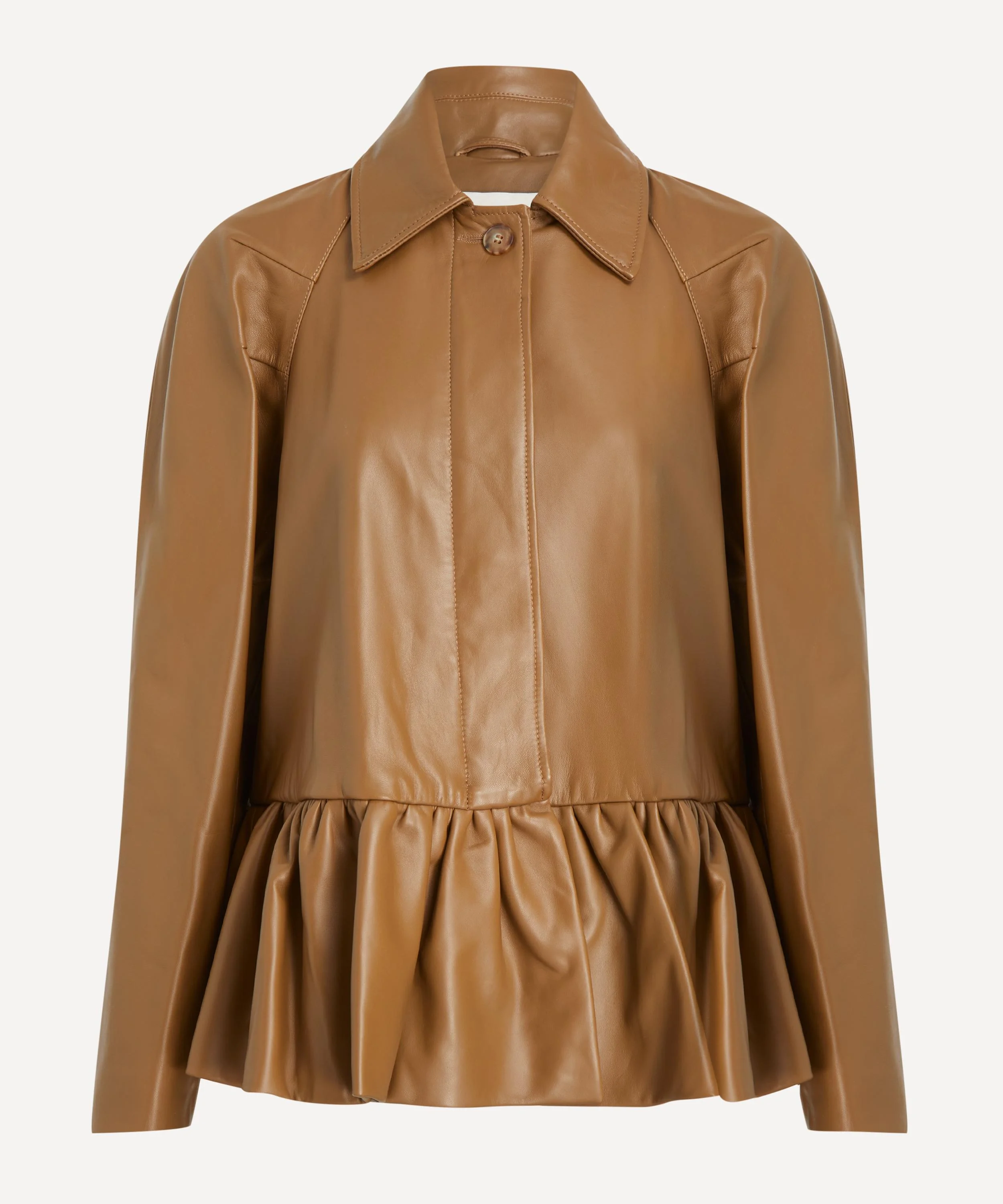DETAILS Nappa leather jacket Fits true to size Raglan sleeves Classic collar Exposed top button Concealed button placket Peplum hem Fully lined SIZE & FIT Model is 175cm/5'9"; Chest: 76cm; Waist: 58cm; Hip: 90cm and wears a size S COMPOSITION & CARE Body: 100% Nappa leather Lining: 100% Viscose Specialist leather dry clean