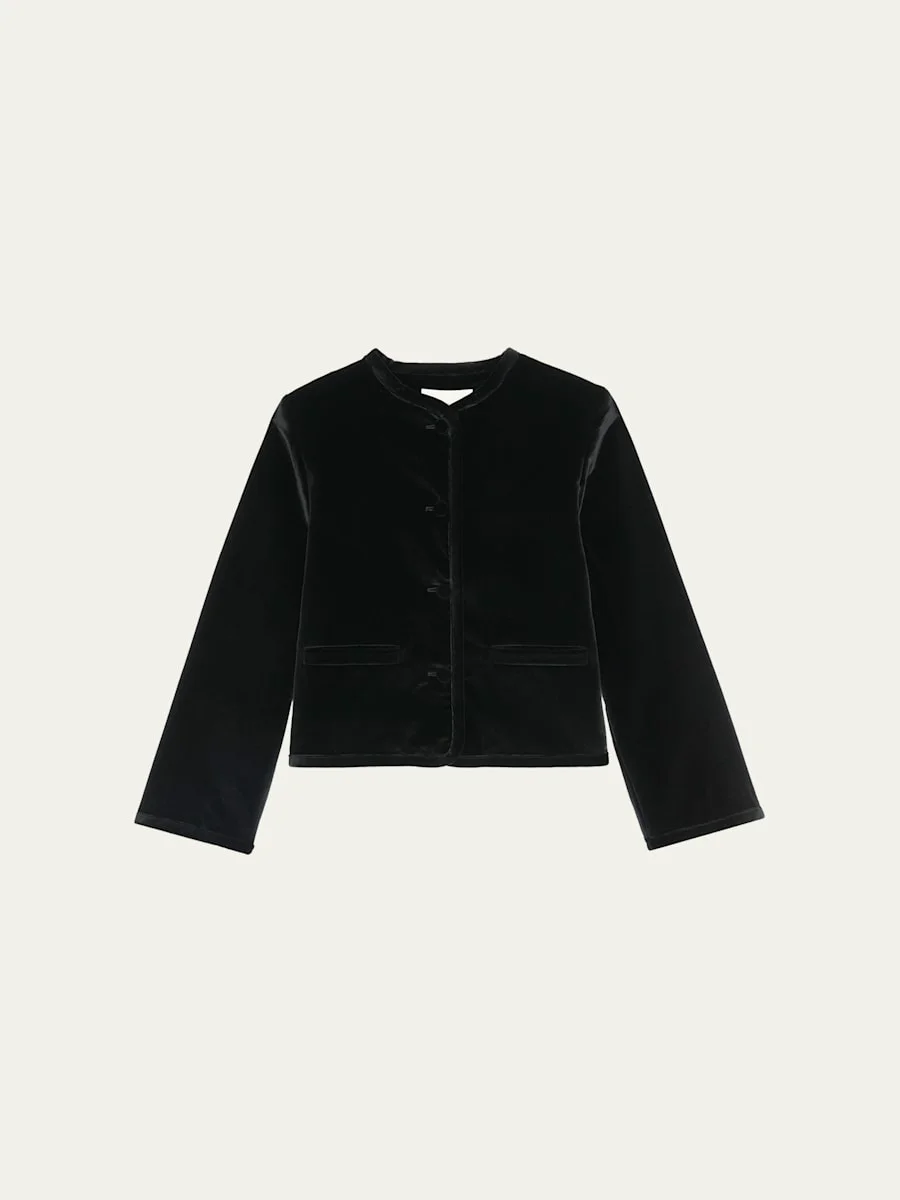 Liberowe "Cora" collarless jacket is crafted from soft velvet accented with velvettrimmed edges and selfcovered plastic buttons Approx. 19"L from shoulder to hem Round neckline; singlebreasted front Long sleeves; approx. 22"L Hip welt pockets Straight fit Hip length Cotton Lining: Viscose/cupro Dry clean Made in United Kingdom
