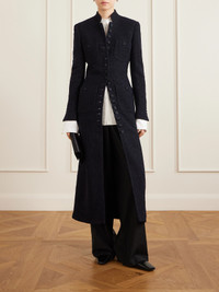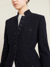 LIBEROWE's 'Imperial' coat draws inspiration from the opulence of Indian royalty. Tailored from wool-blend boucle with metallic threads, it's detailed with a Nehru collar and satin duchess-covered buttons for a regal finish. Responsible Craftsmanship. This product promotes artisanal skills and a brand that invests in communities and adheres to fair-trade principles. Find out more about our NET SUSTAIN criteria here.