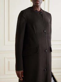 LIBEROWE's ‘Kipling' coat is tailored from pure cashmere in a longline silhouette, complete with front pockets and a built-in scarf - a key detail this season. Rendered in a rich chocolate hue, it works as a versatile neutral within any wardrobe.