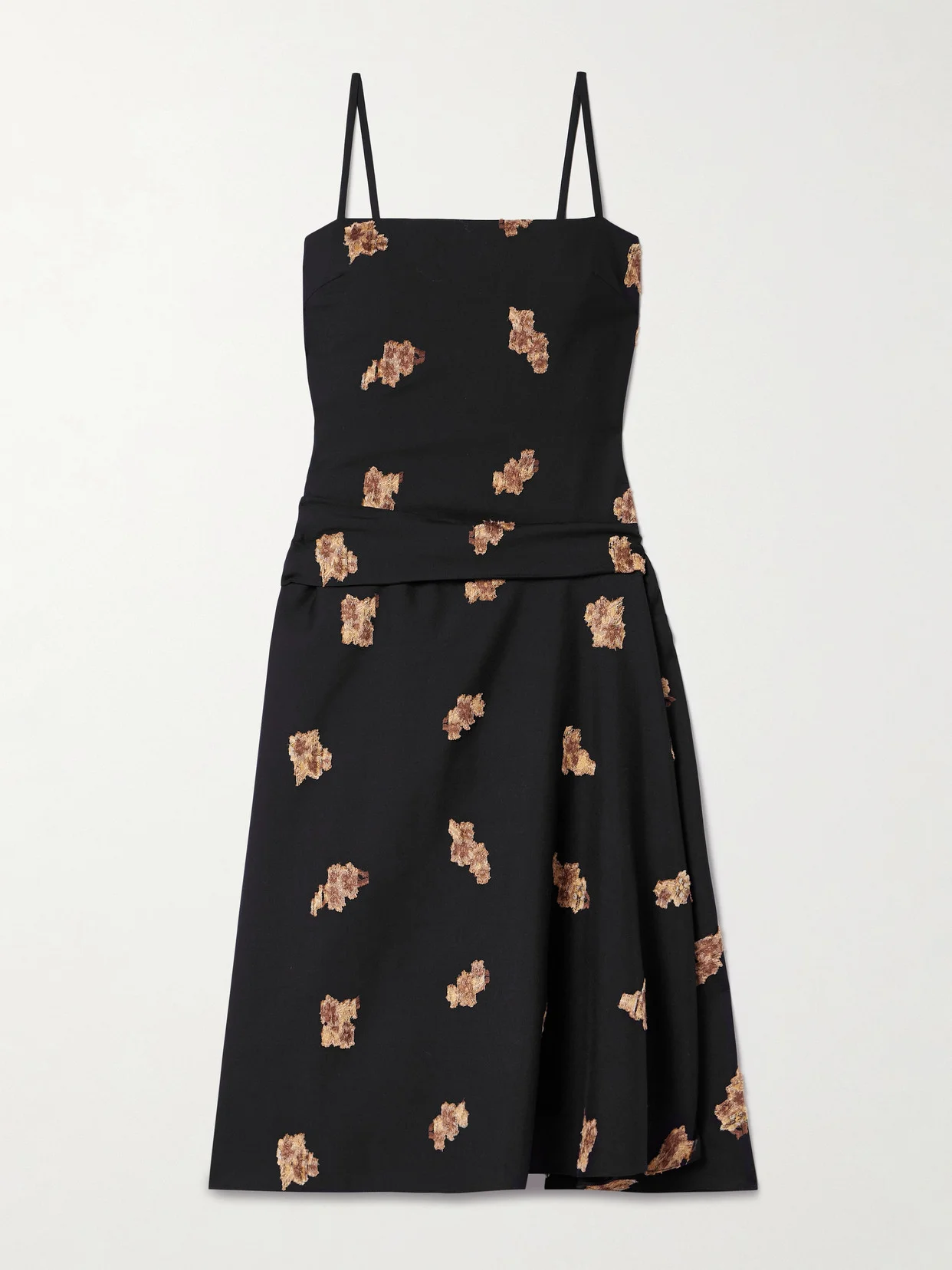 LIBEROWE's 'Victoria' dress is made from wool-blend twill decorated with tactile fil coupe flowers throughout. It's designed with a gathered waist that creates a subtle, elegant drape and rests on adjustable straps that ensure the perfect fit.