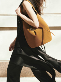 Timeless aesthetic seamlessly merges with modern practicality in the Belted Bucket Bag. Its curved shape, inspired by organic silhouettes found in nature, is cinched with a slender buckle. Perfectly sized to fit a 13” laptop, among other essentials, it’s the ideal pick for workdays in the city. - Hardware with gold finish - Internal zip pocket - Rhum cow suede - Certified Silver Rated Suede by - LWG - Made in Italy DIMENSIONS H: 39 x W: 35 x D: 17,5 cm H: 15,4 x W: 13,8 x D: 6,9 in Handle drop: 25,5 cm / 10 in