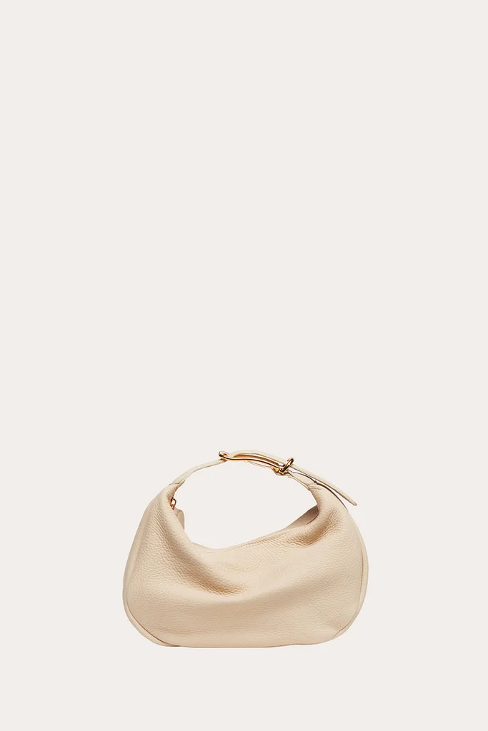 With a soft moon shape in a mini format, the Moon Pouch is the perfect day-to-night companion, keeping your belongings safe with a zip closure. Featuring a slender buckle, it is roomy enough for a phone, gloss and a wallet. - Hardware with gold finish - Cream leather - Certified Calf Leather by - LWG - Made in Italy DIMENSIONS H: 14 x W: 22 x D: 7 cm H: 5,5 x W: 8,6 x D: 2,7 in Handle drop: 9,2 cm / 3,5 in