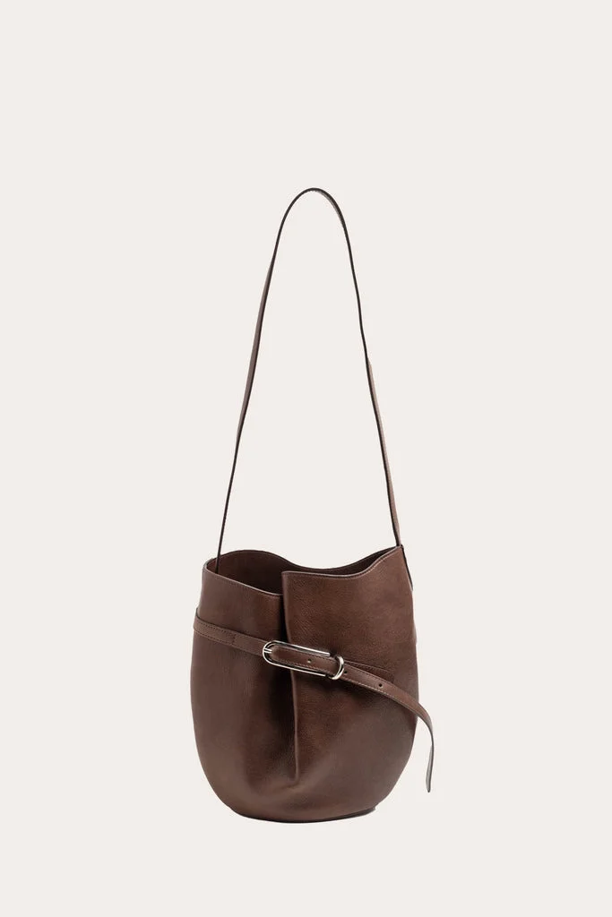 The silhouette of the Belted Bucket Bag echoes seashells, driftwood and other organic shapes found in nature, adding an artful finish to every look. It can be worn on the shoulder or crossbody and is cinched with a slender diagonal buckle that creates soft feminine curves when fastened. In a medium size, it’s equally chic on weekdays and weekends. Crafted from vintage effect leather that's been treated for a well-loved, worn-in look. - Hardware with silver finish - Internal zip pocket - Dark brown vintage effect leather - Certified Calf Leather by - LWG - Made in Italy DIMENSIONS H: 26 x W: 16 x D: 10 cm H: 10,2 x W: 6,3 x D: 4 in Strap drop: 42 - 49 cm / 16,5 - 19,30 in (Adjustable)