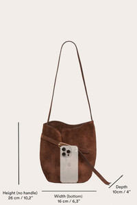 The silhouette of the Belted Bucket Bag echoes seashells, driftwood and other organic shapes found in nature, adding an artful finish to every look. It can be worn on the shoulder or crossbody and is cinched with a slender diagonal buckle that creates soft feminine curves when fastened. In a medium size, it’s equally chic on weekdays and weekends. - Hardware with silver finish - Internal zip pocket - Brown - Certified Calf Leather by - LWG - Made in Italy DIMENSIONS H: 26 x W: 16 x D: 10 cm H: 10,2 x W: 6,3 x D: 4 in Strap drop: 42 - 49 cm / 16,5 - 19,30 in (Adjustable)