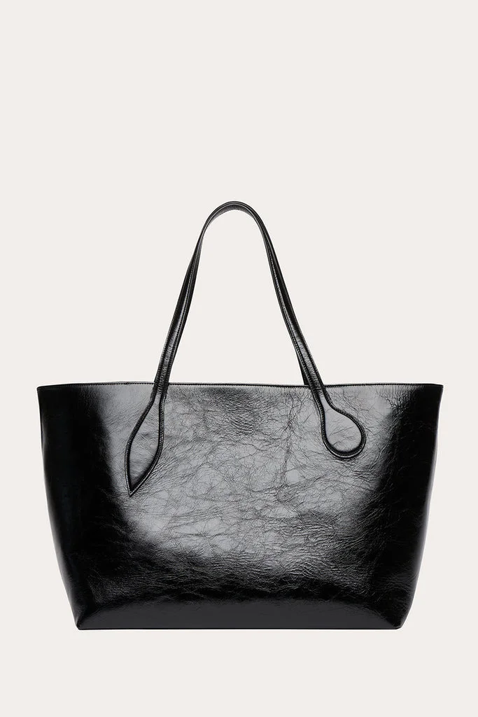Refined and artistic yet slouchy and oversized. A bold tote large enough to fit all your weekend getaway essentials. Please note - this is a large tote bag, please double check the measurements before placing your order. - Snap button closure - Internal zip pocket - Black glossy leather - Certified Calf Leather by - LWG - Made in Italy DIMENSIONS Fits a 13-15" laptop H: 35 x W: 58 x D: 28 cm H: 13.8 x W: 22.8 x D: 11 in Handle drop: 26 cm / 10.2 in