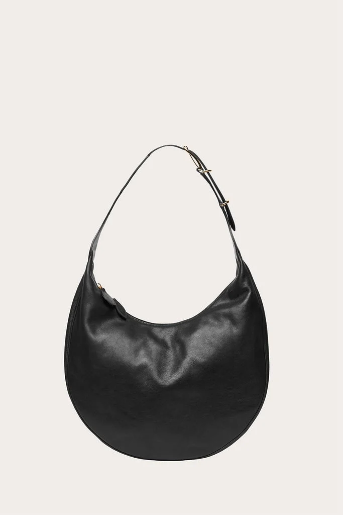 Deceptively spacious - it fits a laptop - our Moon Hobo is the new take on a work week essential. Its crescent silhouette comes in suede or new vintage effect leather that's been treated for a well-loved effect. A zipper keeps all items secure and a slender buckle on the handle adds a touch of glamour. Carry it on the shoulder or cross body. - Hardware with gold finish - Internal zip pocket - Smooth black leather - Certified Calf Leather by - LWG - Made in Italy DIMENSIONS H: 27,5 x W: 40 x D: 9 cm H: 10,6 x W: 15,7 x D: 3,5 in Handle drop: 37 - 42 cm / 14,5 - 16,5 in (Adjustable)