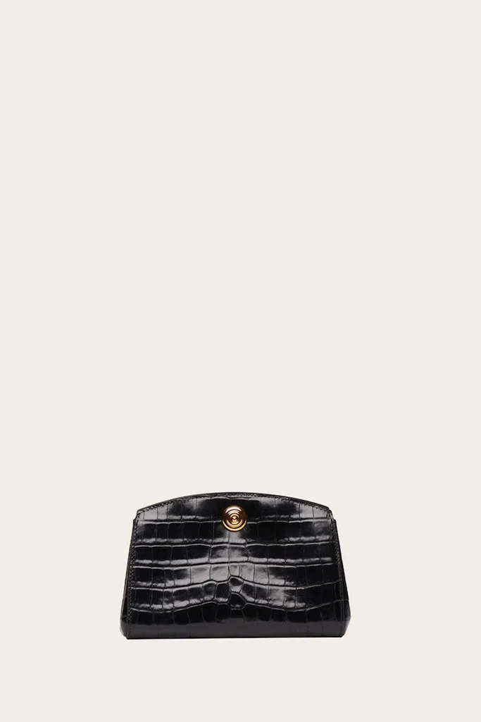 Minimalist Pushlock Clutch is a considered choice for formal evenings. It comes in two options—vintage effect leather and suede— and is detailed with a mandala-inspired metallic lock. Stow your phone, keys, and maybe a small card deck inside. - Metal pushlock closure - Hardware with gold finish - Black croc-embossed leather - Certified Calf Leather by - LWG - Made in Italy DIMENSIONS H: 14 x W: 25 x D: 6,5 cm H: 5,5 x W: 9,8 x D: 2,5 in