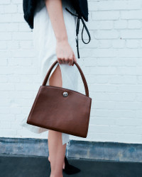 Named for the gleaming mandala-shaped push lock that keeps your belongings secure, this polished shoulder bag excels on busy days that start with meetings and end with martinis. Our vintage-effect leather has a timeless, worn-in look from the start and will continue to age beautifully over time. - Metal pushlock closure - Hardware with silver finish - Dark brown vintage effect leather - Top handle - Certified Calf Leather by - LWG - Made in Italy DIMENSIONS H: 19 x W: 28 x D: 9,5 cm H: 7,4 x W: 11 x D: 3,7 in Handle drop: 14 cm / 5,5 in