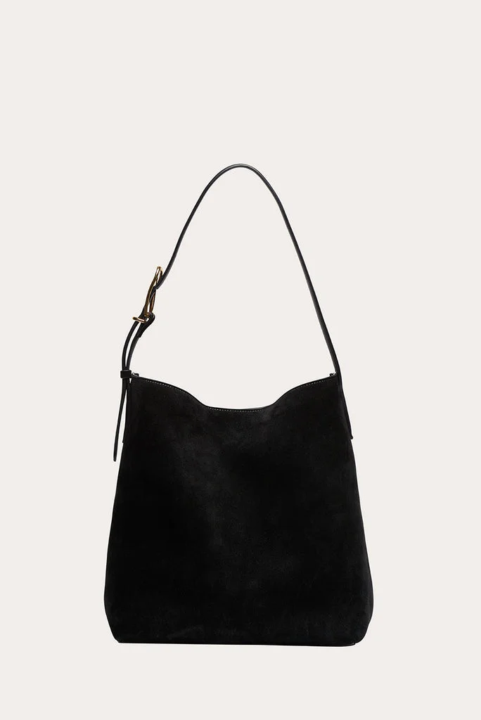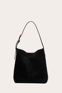 Unlined suede makes The Slouch Bucket Bag effortlessly lightweight, accentuating its boho-inspired silhouette and sculptural folds. Designed to fit a 13” laptop, a notebook or a tablet, the bag is finished with contrast white stitching and a longer strap. - Hardware with gold finish - No lining - Internal pocket - Black - Certified Silver Rated Suede by - LWG - Made in Italy DIMENSIONS H: 33 x W: 43 x D: 19 cm H: 13 x W: 16,9 x D: 7,5 in Handle drop: 30 cm / 11,8 in