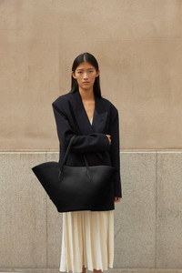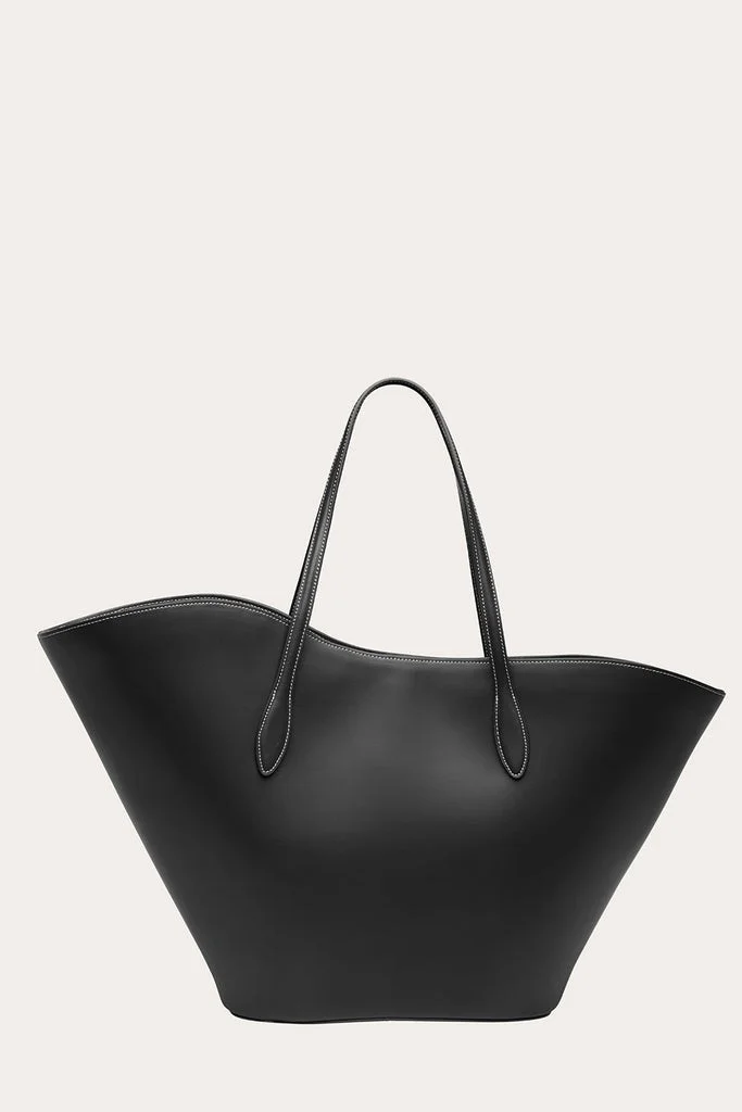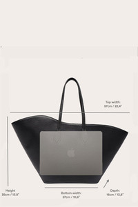 Our refined touch on the classic Tulip Tote with flat handles meant to be worn on the shoulder. Roomy everyday tote brings together inspiration from minimalist sculpture and organic shapes in nature. It combines functionality with flowing lines to create the perfect bag for elevated everyday wear. - Snap button closure - Internal zip pocket - Cotton canvas lining - Black - Certified Calf Leather by - LWG - Made in Italy DIMENSIONS H: 35 x W: 55 (top) x D: 16 cm H: 13.7 x W: 21,6 x D: 6,2 in Handle drop: 22 cm / 8,7 in
