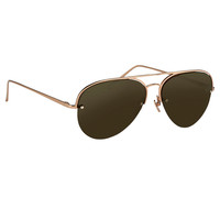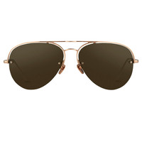 Luxurious aviator sunglasses from Linda Farrow featuring solid brown nylon lenses, contoured by a thin 18-22 carat rose gold-plated Japanese titanium top bar, inner rim and nose bridge that creates a floating effect. Streamlined, co-ordinating slim temples are tapered with Japanese bulb tips and adjustable nose pads provide superior levels of comfort, with the Linda Farrow logo in signature white inset in the inverted side of the temple. Size & Fit 60mm lens width 16mm bridge width 145mm temple length
