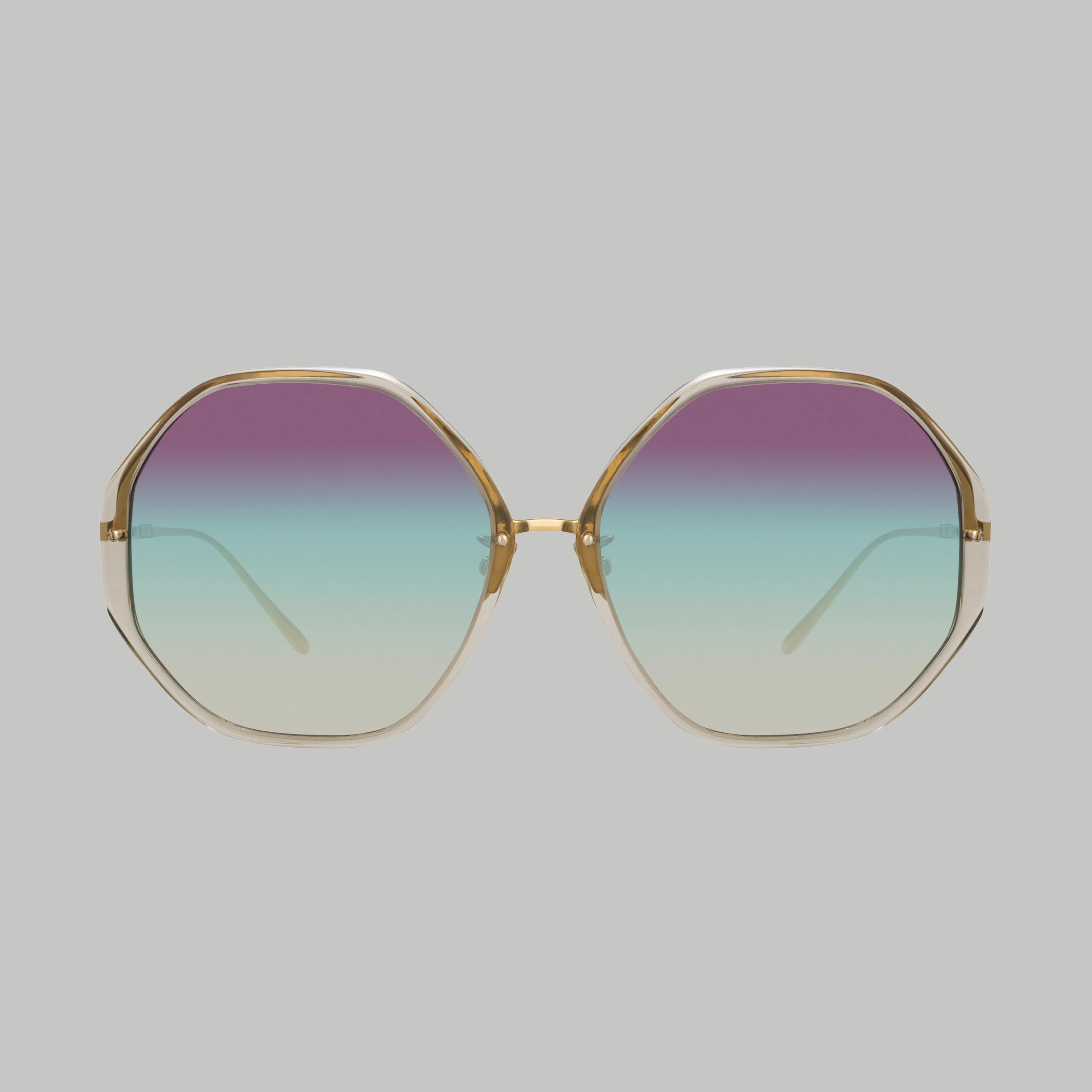 Introducing new colours of our Iconic Alona sunglasses. The oversized hexagonal frames from the LINDA FARROW collection follow classic design elements of the brand executed with precision. Finely polished truffle grey acetate rims are paired with a delicate 22 carat light gold plated frame work which outlines the inner brow and runs into sleek tapered temples. Fitted with purple to green graduated nylon lenses offer anti-glare and 100% UV protection. Adjustable nose pads allow for a tailored fit.
