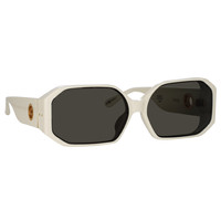 Introducing Bailey. These angular sunglasses are sculpted from white acetate and fitted with grey solid lenses. Set into the temple our signature 22 carat gold plated logo eyelets. Keep your frames protected in the LINDA FARROW travel case. Details -100% UV protected solid lenses -Acetate frame with acetate temples -Made in Japan -sku:LFL1427C2SUN Size & Fit 62mm lens width 15mm bridge width 140mm temple length