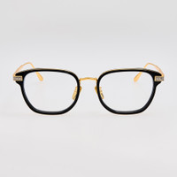An elevated D-frame silhouette crafted from Italian black acetate and contrasting 22 karat gold plated pure Japanese titanium temples. This refined optical frame features a strong architectural brow line, sculpted temples, and adjustable nose pads for enhanced comfort. Details -Country of origin: Japan -Optical lens free from prescription -Titanium frame with titanium temples -sku:LFL1579C1OPT Size & Fit 52mm lens width 18mm bridge width 145mm temple length