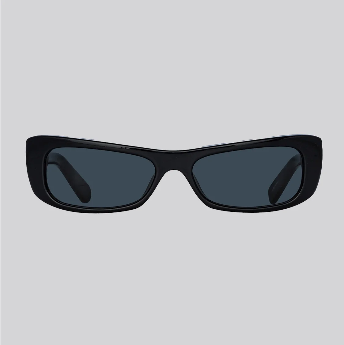 Introducing the Capri sunglasses from the Jacquemus collaboration. These rectangular sunglasses in black are paired with grey lenses and gold temple detailing. Details -100% UV protected solid lenses -Acetate frame with acetate temples -Acetate Made in Italy -sku:JAC55C1SUN Size & Fit " 55mm lens width 16mm bridge width 145mm temple length "