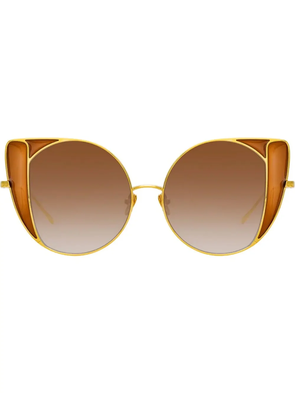 cat eye sunglasses Brown cat eye sunglasses from Linda Farrow featuring straight arms with curved tips, gradient lenses and a single nose bridge. This item comes with a protective case. Imported Composition Outer: Titanium 100%, Nylon 100% SIZE & FIT Measurement LENGTH 5.51 in(14 cm) Bridge Width 0.66 in(1.7 cm) Lens Diameter 2.12 in(5.4 cm)