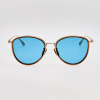 A bold take on a timeless silhouette, the Dahlia frame is crafted from 22 carat light gld plated pure Japanese titanium in a polished oval shape. Fitted with aqua lenses offering full UV protection and sculpted adjustable nose pads for a secure, lightweight fit. Details -Country of origin: Japan -100% UV protected lenses -Titanium frame with titanium temples -sku:LFL1580C5SUN Size & Fit 52mm lens width 18mm bridge width 145mm temple length