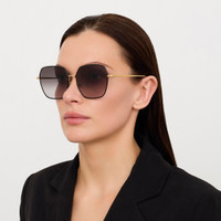 Introducing the DARCIE frame. These sunglasses feature an oversized silhouette crafted from ultra-lightweight Japanese titanium plated in 22 carat yellow gold. The black rim add bold contrast to the luminous gold structure. Finished with gradient grey lenses offering full UV protection, the frame features adjustable nose pads for a tailored fit. Details -Country of origin: Japan -100% UV protected lenses -Titanium frame with titanium temples -sku:LFL1576C1SUN Size & Fit 60mm lens width 16.5mm bridge width 145mm temple length