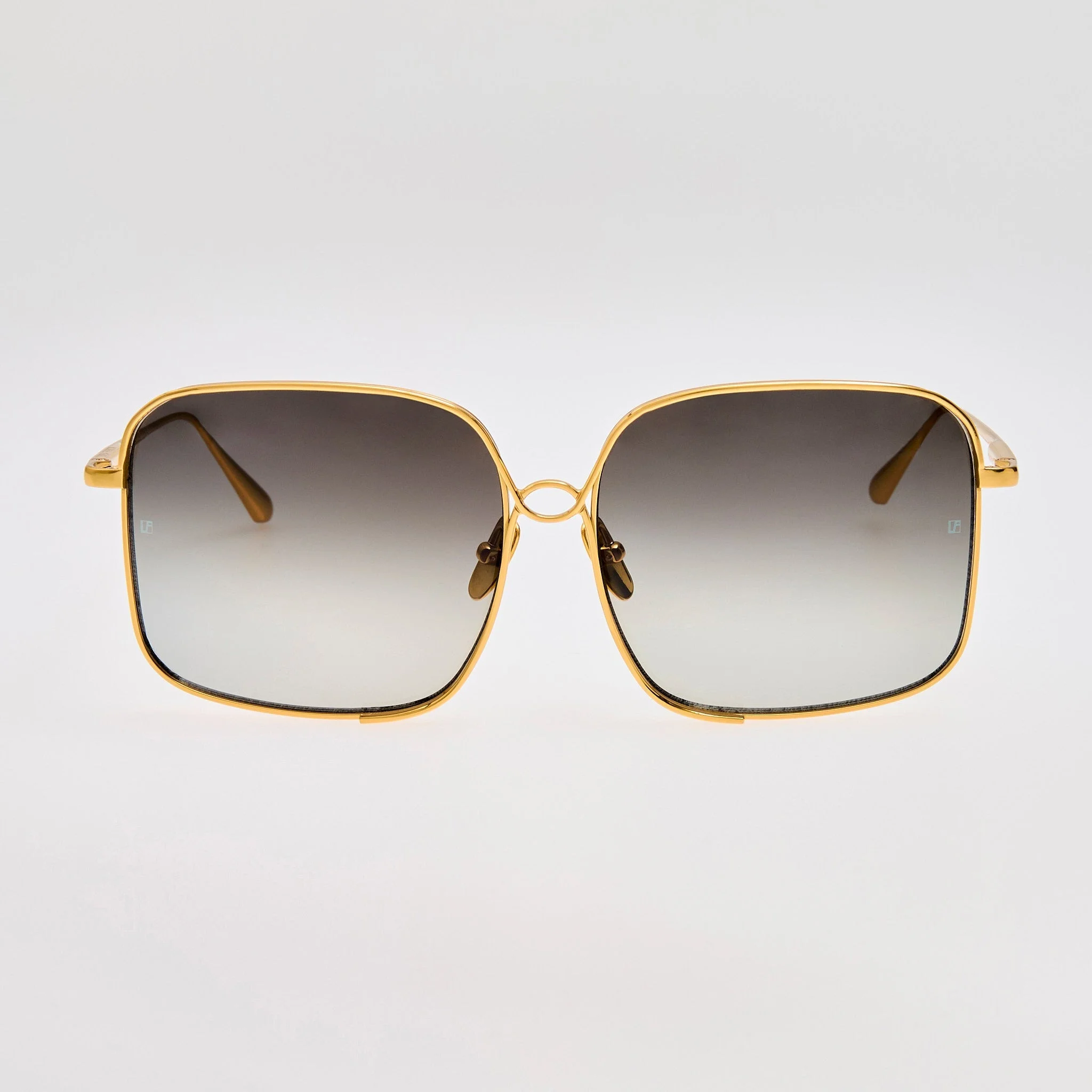 The Genevieve square oversized frame is crafted from 22 carat yellow gold-plated pure Japanese titanium. Grey gradient lenses offer complete UV protection, while sculpted adjustable nose pads ensure a secure and comfortable fit. Lightweight and sophisticated, this style delivers effortless luxury for everyday wear. Details -Country of origin: Japan -100% UV protected lenses -Titanium frame with titanium temples -sku:LFL1597C1SUN Size & Fit 60mm lens width 15mm bridge width 145mm temple length