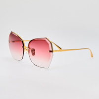 The LILA is an oversized rimless frame crafted from 22 carat yellow gold-plated pure Japanese titanium, offering a bold and elegant silhouette. This frame features red gradient lenses with 100% UV protection, delivering style and sun safety in one. Designed for comfort, it includes adjustable titanium nose pads for a tailored fit. Details -Country of origin: Japan -100% UV protected lenses -Titanium frame with titanium temples -sku:LFL1546C6SUN Size & Fit 69mm lens width 15mm bridge width 140mm temple length