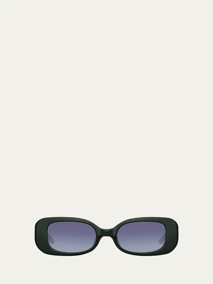 Linda Farrow "Lola" rectangle sunglasses in acetate and nylon Lens/bridge/temple (in mm): 5220140 Saddle nose bridge Logo engraved cutouts on temples Wide, tapered arms 100% UVA/UVB protection Made in Japan