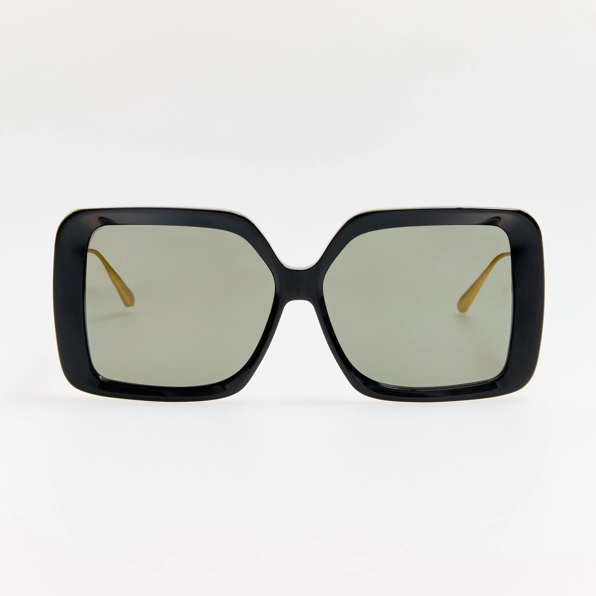 Introducing the Macy oversized frame is crafted from Italian black acetate rims and contrasting 22k gold plated Japanese titanium temples featuring a geometric cut-out design ,giving them a sculptural, high-fashion appearance. Fitted with grey lenses offering full UV protection and sculpted nose pads for a tailored fit. Details -Country of origin: Japan -100% UV protected solid lenses -Acetate and titanium frame with titanium temples -sku: LFL1642C1SUN Size & Fit 59mm lens width 13mm bridge width 145mm temple length
