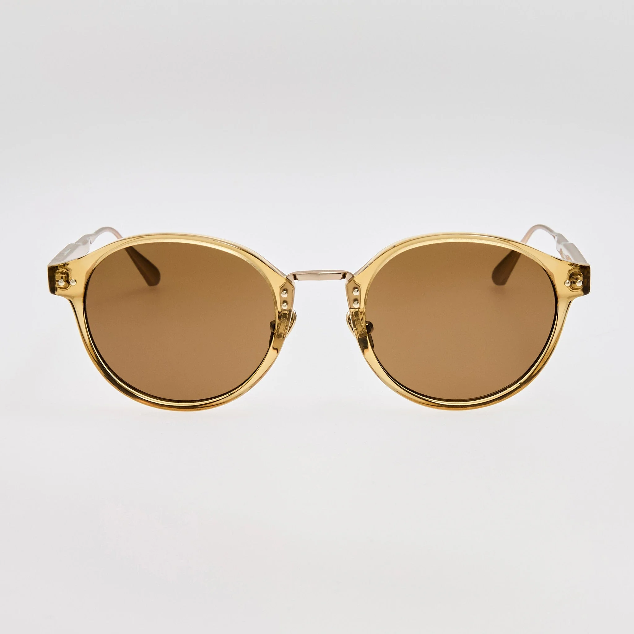 Discover refined elegance with the Marco sun model, featuring a combination frame of 22 carat yellow gold temples paired with khaki Italian acetate. The oval frame shape houses green lenses that provide superior UV protection. Made with high-quality materials, this frame combines durability with a lightweight feel and includes laminated nose pads for optimal comfort. Details -Country of origin: Japan -100% UV protected lenses -Acetate frame with titanium temples -sku:LFL1535C8SUN Size & Fit 49mm lens width 21mm bridge width 145mm temple length
