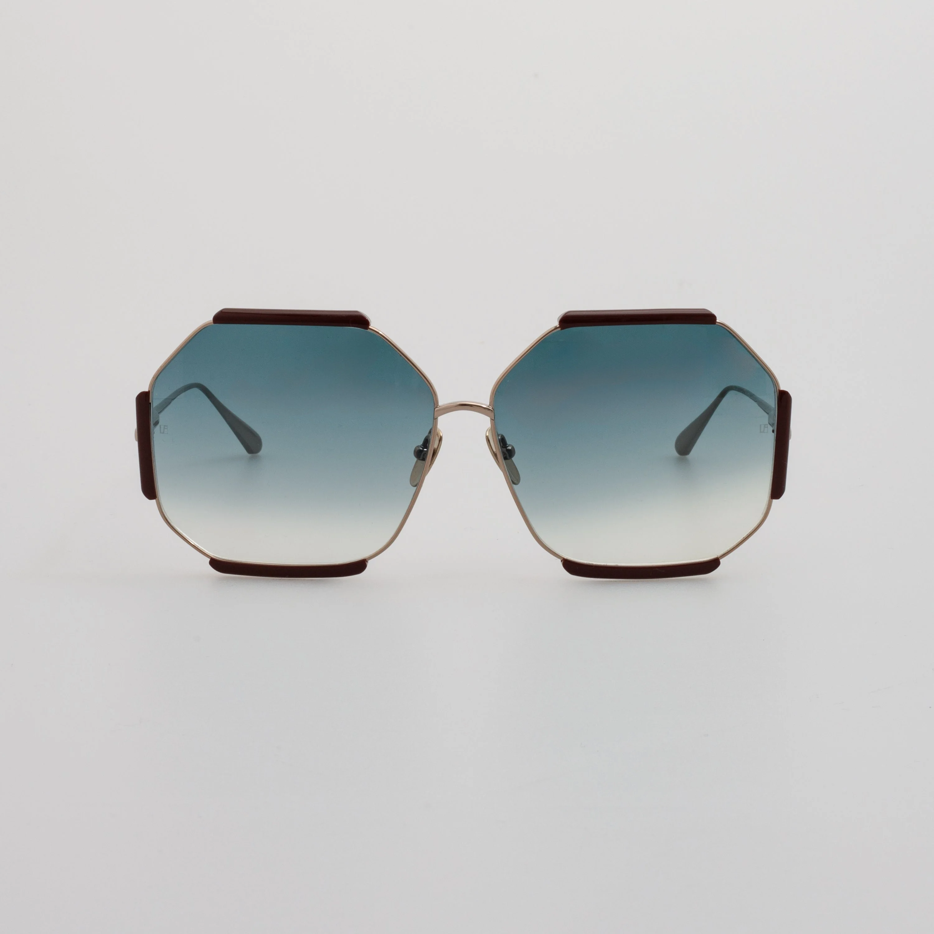 Reminiscent of 1970s playful allure these hexagon sunglasses channel a quintessential LINDA FARROW design language. A delicate 22 carat light gold plated titanium rim is accented with glossy brown acetate details. Our graduated temple sweeps from hinge to tip leading to a rounded end which provides comfort to the wearer.The style is fitted with soft aqua gradient nylon lenses which offer anti-glare and 100% UV protection.The frame is completed with a discreet logo nose bridge and adjustable nose pads for a tailored fit. Details -Country of origin : Japan -100% UV protected solid lenses -Titanium frame with titanium temples -sku:LFL1308C7SUN Size & Fit 66.5mm lens width 13mm bridge width 145mm temple length "