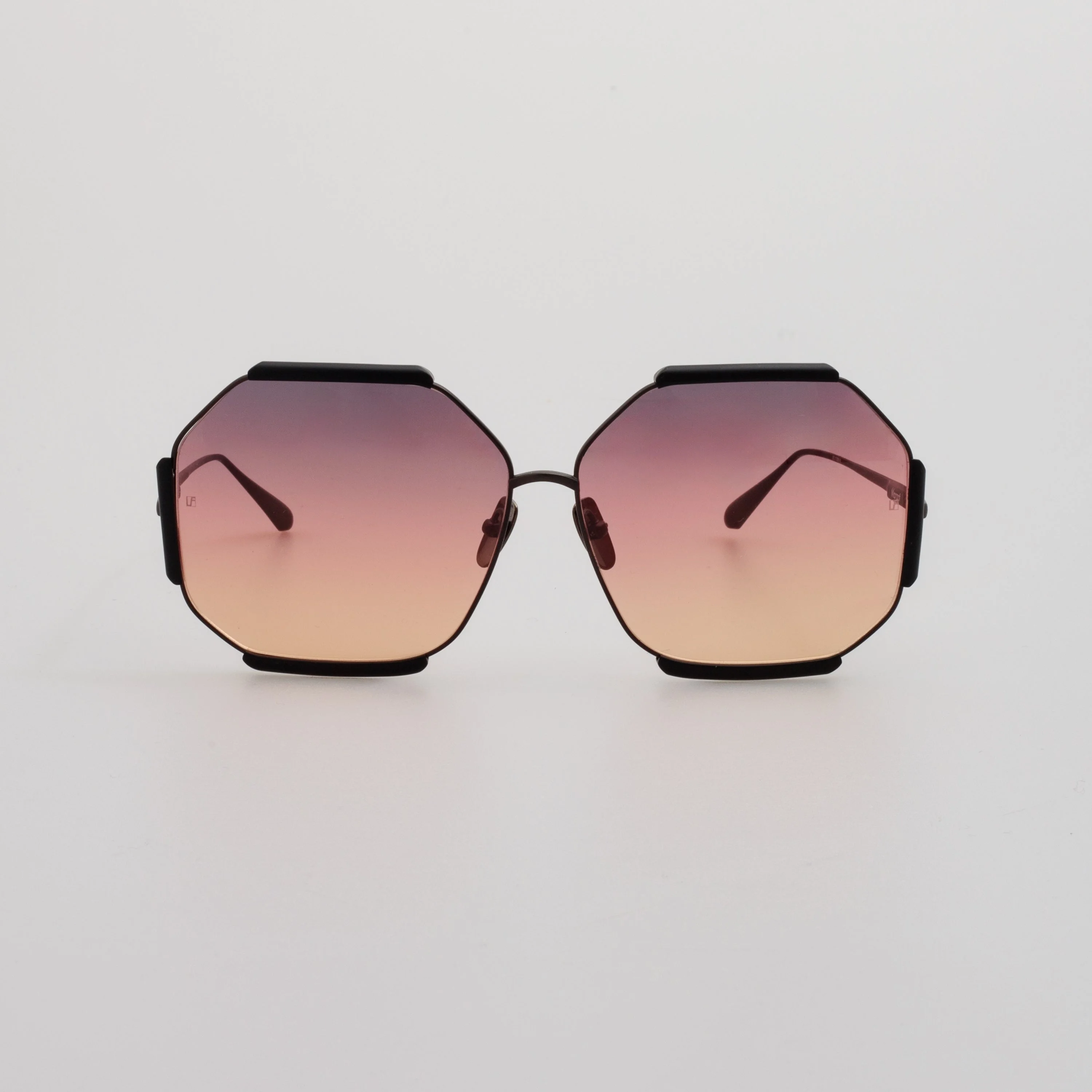 Reminiscent of 1970s playful allure these hexagon sunglasses channel a quintessential LINDA FARROW design language. A delicate matt nickel titanium rim is accented with glossy black acetate details. Our graduated temple sweeps from hinge to tip leading to a rounded end which provides comfort to the wearer. The style is fitted with soft sunset gradient nylon lenses which offer anti-glare and 100% UV protection. The frame is completed with a discreet logo nose bridge and adjustable nose pads for a tailored fit. Details -Country of origin : Japan -100% UV protected solid lenses -Titanium frame with titanium temples -sku:LFL1308C8SUN Size & Fit 66.5mm lens width 13mm bridge width 145mm temple length "