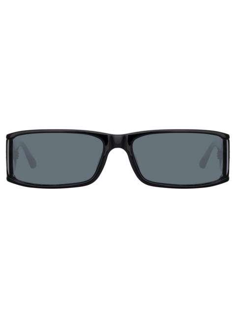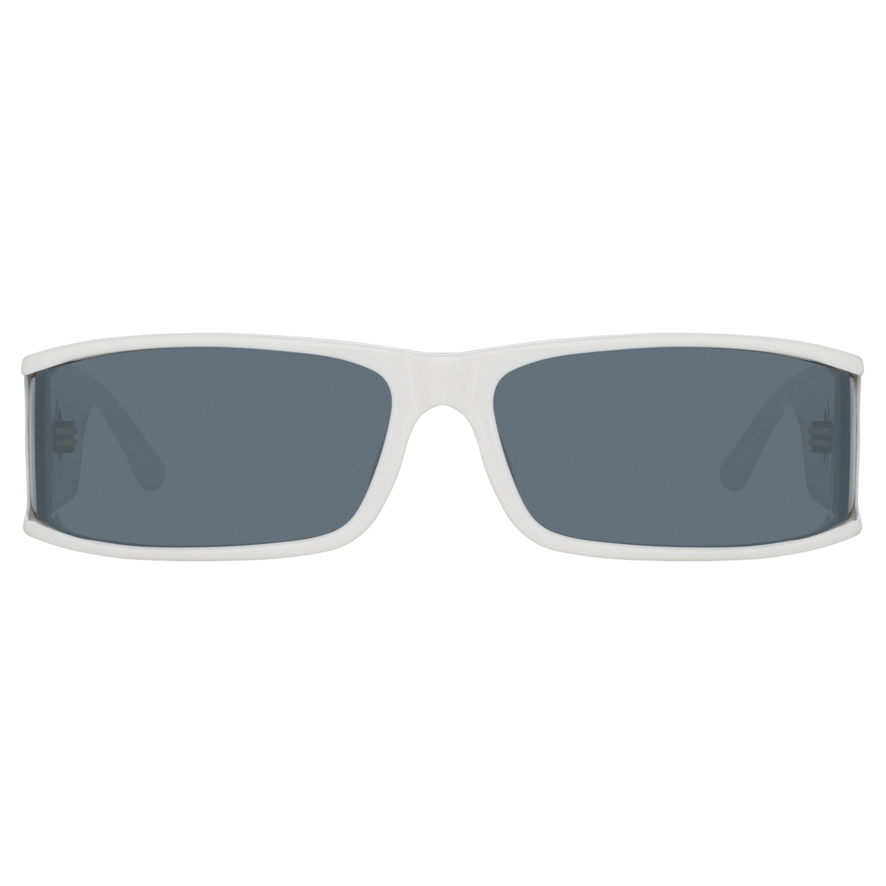 The sleek rectangular silhoutte of the Mya sunglasses play with sharp angles to create form and add intrigue. Sculpted from optic white acetate the frame holds a right angled lens which extends to a side shield detail. The temple bears the LINDA FARROW signature titanium plated eyelet. Grey nylon lenses offer anti-glare and 100% UV protection. Laminated acetate temple tips provide comfort to the wearer. Details -100% UV protected solid lenses -Acetate frame with acetate temples -Made in Japan -sku:LFL1274C3SUN Size & Fit 68mm lens width 18mm bridge width 140mm temple length