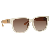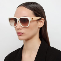 These expertly polished D-Frame sunglasses are crafted from rich white acetate. Sculpted nose pads and peach temple tips to provide additional comfort to the wearer. The style carries 22 carat light gold plated eyelets set into the temples in celebration of the founding of the brand in LONDON 1970. Keep your frames protected in the LINDA FARROW travel case. Details -100% UV protected soild lenses -Acetate frame with acetate temples -Acetate Made in Italy -sku: LFL1429C3SUN Size & Fit 61mm lens width 15mm bridge width 145mm temple length