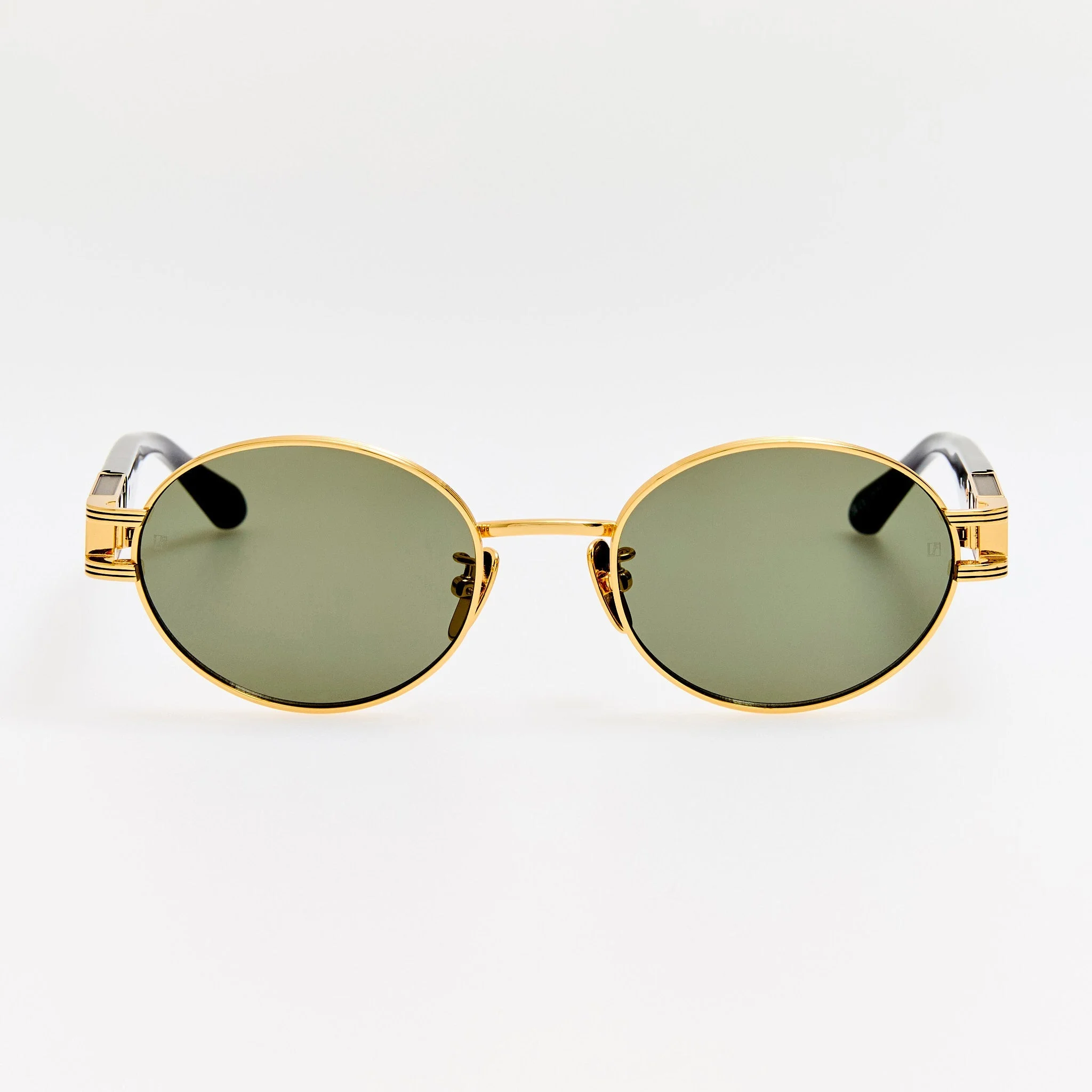 The Phoebe oval frame features a chunky 22k gold plated pure Japanese titanium structure fitted with solid grey lenses, offering full UV protection. The temples are inset with our signature gold plated titanium eyelet bearing the brand logo and crafted from black Italian acetate. The frame is fitted with adjustable titanium nose pads that offer a tailored fit by allowing bespoke positioning for enhanced comfort. Details -Country of origin: Japan -100% UV protected solid lenses -Acetate and titanium frame with titanium temples -sku: LFL1657C1SUN Size & Fit 50mm lens width 20mm bridge width 145mm temple length