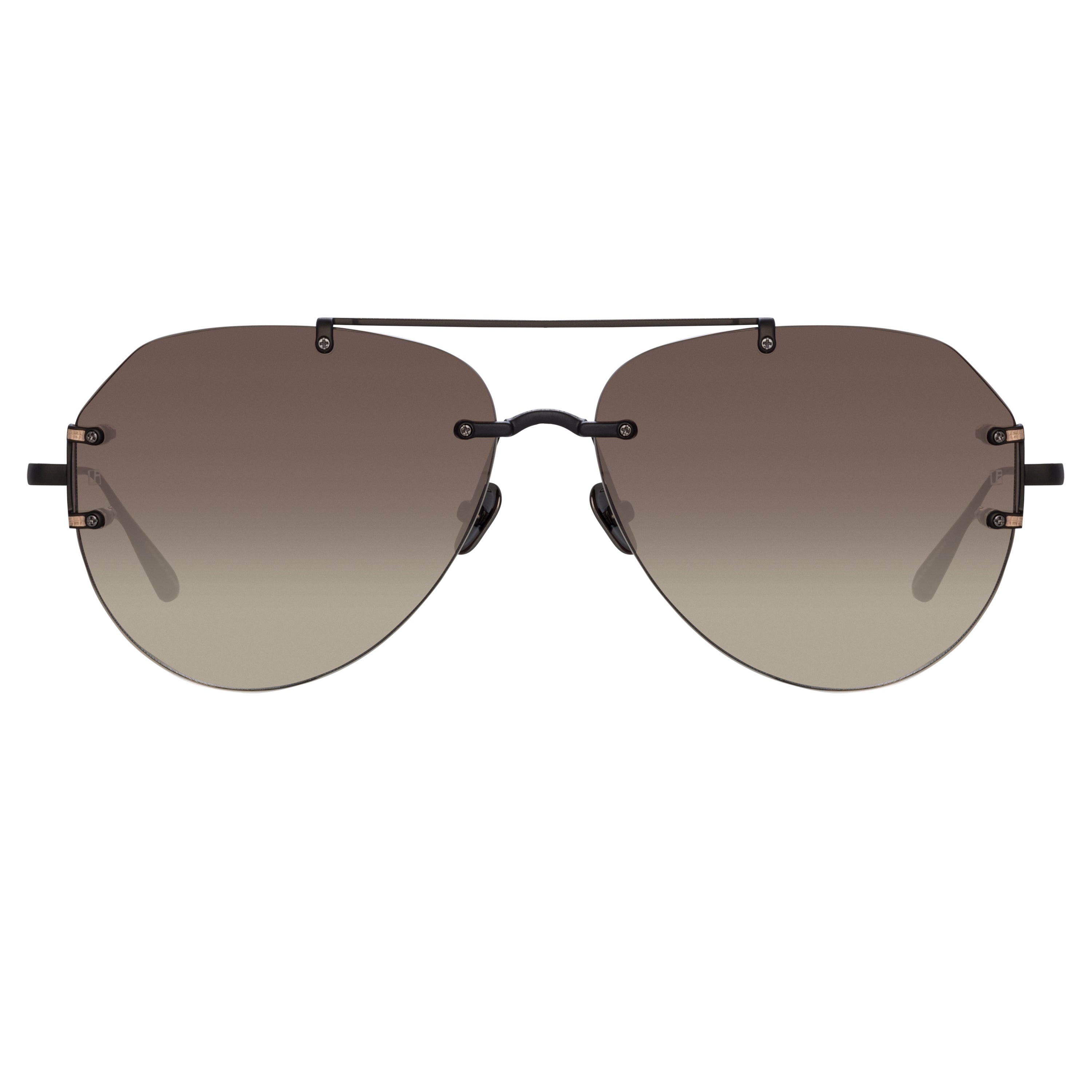 The angular lenses provide the focal point for these aviator sunglasses from the LINDA FARROW collection. Expertly cut and hand polished the 3mm lenses have a luxuriously rounded high shine edge. Pure titanium has been sculpted to form delicate clasps layered with etched detailing which hold the lenses in place. Details -100% UV protected gradient lenses -Titanium frame with titanium temples -Made in Japan -sku:LFL1266C1SUN Size & Fit 62mm lens width 13mm bridge width 145mm temple length