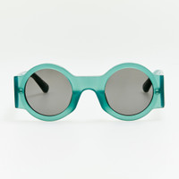 The round frame is crafted from Italian acetate in teal. Fitted with blue lenses offering full UV protection. The frame features sculpted nose pads for a tailored fit. Famed for his use of colour and print, our collaboration with Dries van Noten is an extension of his fashion line and design ethos. Each piece reflects the brand’s signature craftsmanship and visual poetry — from high-polish acetate finishes and sculptural feminine cat-eye silhouettes to deep jewel-tone hues that capture light and emotion in equal measure. Details -Country of origin: Japan -100% UV protected solid lenses -Acetate frame with acetate temples -Acetate Made in Italy -sku: DVN98C28SUN Size & Fit 44.5mm lens width 28mm bridge width 145mm temple length
