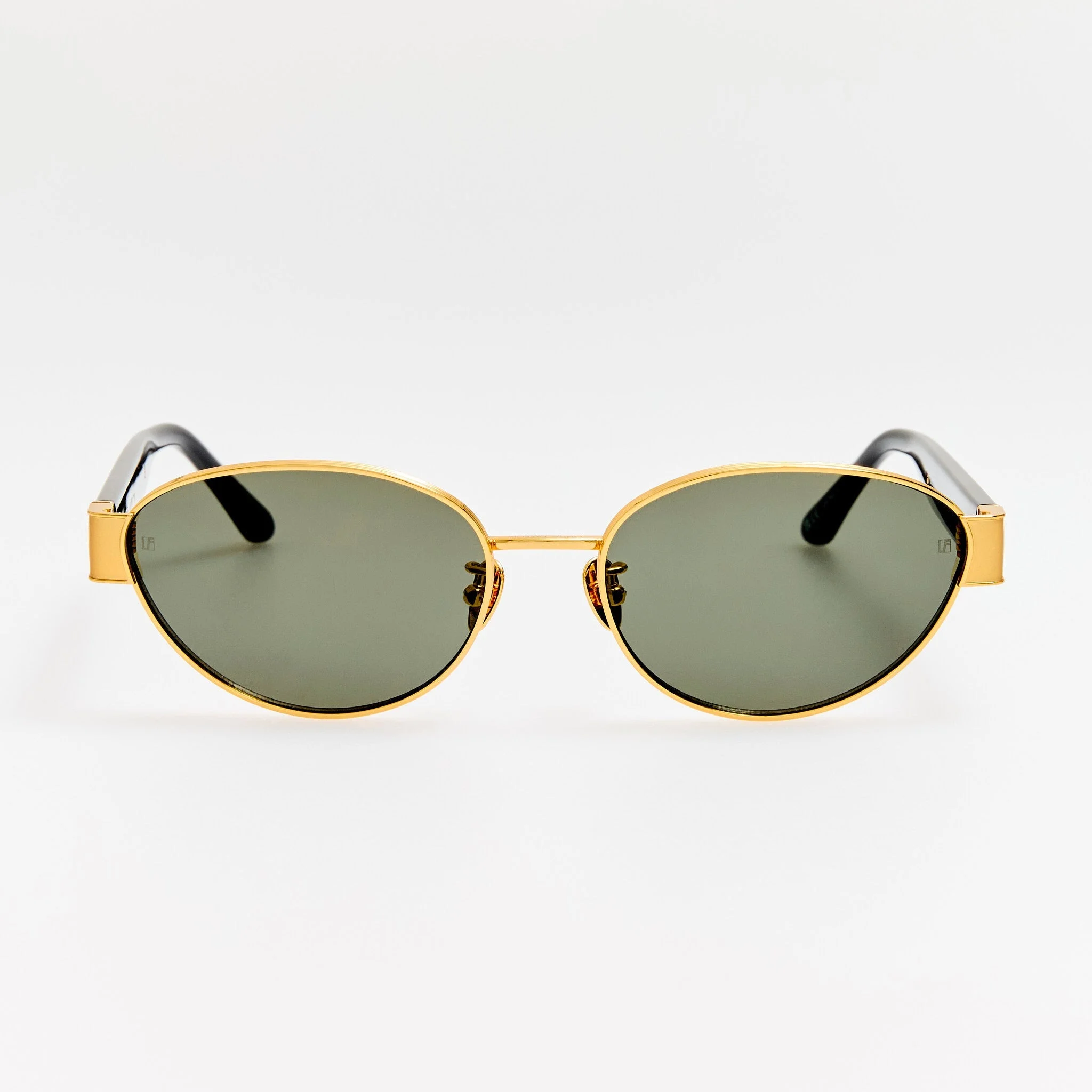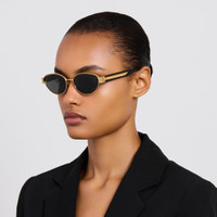 The Sheri cat eye frame features a chunky 22k gold plated pure Japanese titanium structure fitted with solid grey lenses, offering full UV protection. The temples are crafted from black Italian acetate with gold accents , adding a luxurious touch. The frame is fitted with adjustable titanium nose pads that offer a tailored fit by allowing bespoke positioning for enhanced comfort. Details -Country of origin: Japan -100% UV protected solid lenses -Acetate and titanium frame with titanium temples -sku: LFL1656C1SUN Size & Fit 56mm lens width 17mm bridge width 145mm temple length