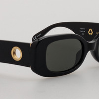 These rectangular sunglasses from the LINDA FARROW collection are sculpted from Italian acetate and hand polished to achieve a glossy high-shine. Crafted from recycled black the frame has built in nose pads and rounded temple tips to ensure a comfortable fit. The frame is fitted with solid grey ZEISS technology lenses chosen for optimum clarity and UV protection. The style is complemented with 22 carat yellow gold plated monogrammed hardware and hinges. Details -100% UV protected soild lenses -Acetate frame with Acetate temples -Made in Japan -sku:LFL1117C1SUN Size & Fit 52mm lens width 20mm bridge width 140mm temple length