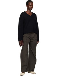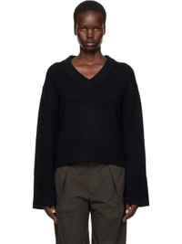 5-gauge and 510 g knit organic cashmere sweater. · Rib-knit plunging V-neck, hem, and cuffs · Dropped shoulders · Extended cuffs Supplier color: Black