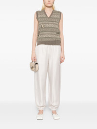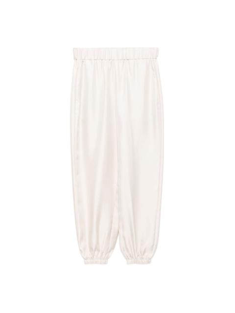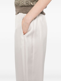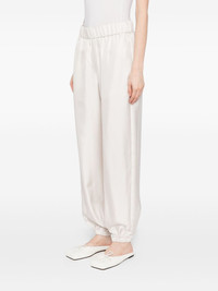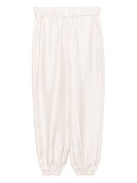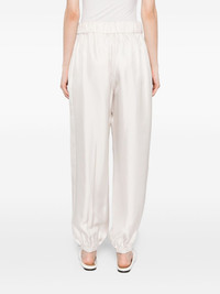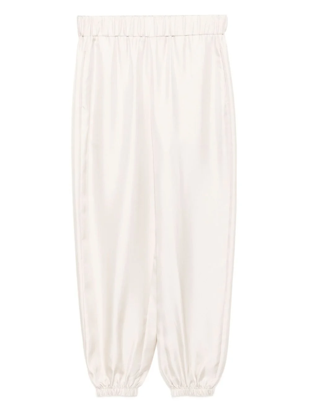 silk trousers Highlights - Ecru - Elasticated band - Two side welt pockets Imported Composition Silk 100% SIZE & FIT Model measurements Height 5 ft 9 in(1.76 m) Bust/Chest 31.1 in(79 cm) Hips 35.03 in(89 cm) Waist 24.4 in(62 cm) FittingInformation Designed for a tapered fit, these trousers allow for a close fit at the waist and a loose unrestricted fit over the leg with a closer fit towards the ankle The elasticated hem at the ankle allows for movement and a comfortable fit Made from a midweight non-stretch fabric Washing instructions Dry Clean Only