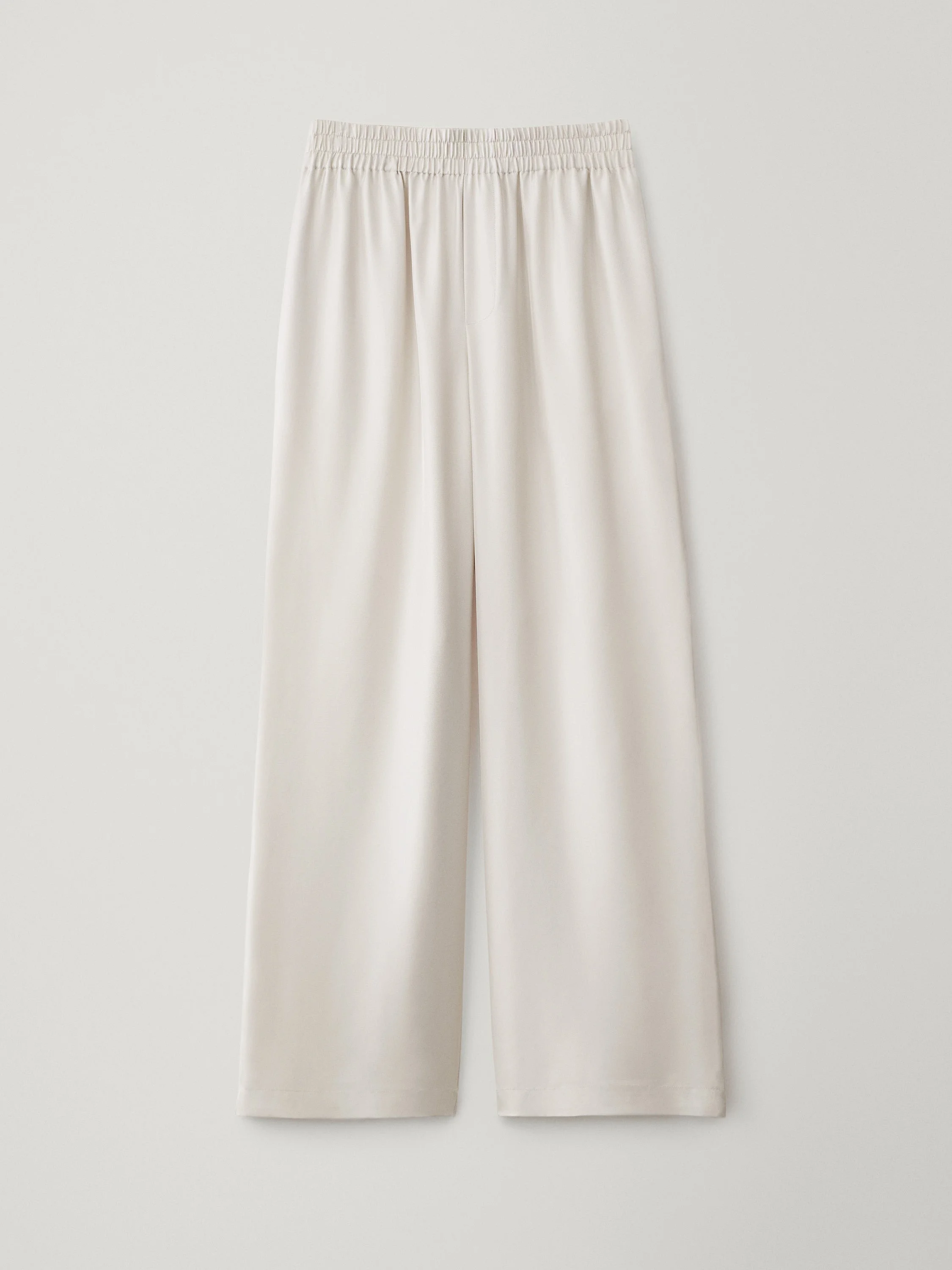 <!--td {border: 1px solid #cccccc;}br {mso-data-placement:same-cell;}--> In woven twill silk, the wide leg trouser has a relaxed full-length fit through the leg, with a mid-rise, elasticated pull-on waistband. Pair with the combining tops from the woven silk edit for a complete look, or with pieces in cashmere from across the collection. DETAILS Knit type: Woven Silk Weight: 195g Composition: 100% Silk SIZE GUIDE * European sizing * Designed for a regular fit * The model is 178 cm/5'10" tall and wears a size 1 Our sizes: Size 0: XS Size 1: S-M Size 2: M-L