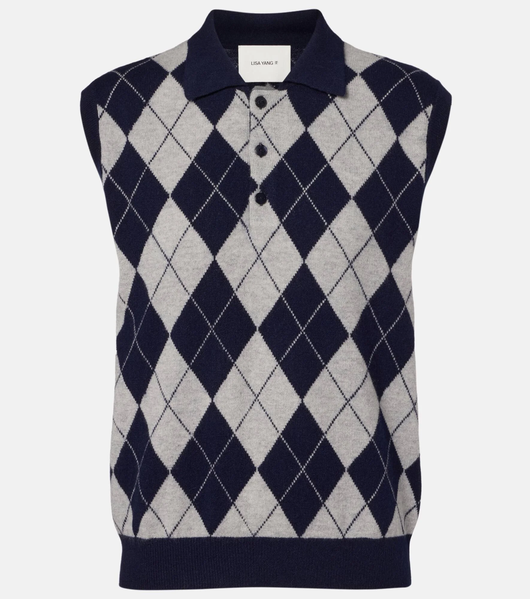 Designed in Stockholm and produced in Inner Mongolia, Lisa Yang's knitwear draws inspiration from Scandinavian minimalism and the designer's Chinese heritage. The Riana sweater vest is made from cashmere, showcasing a classic argyle pattern and a polo collar. Product Details - Material: 100% cashmere - Care instructions: dry clean - Made in Inner Mongolia - Designer color name: Dove Grey / Navy - Item color: gray, blue - Hem: ribbed - Collar: polo collar - Closure: partially buttoned front - Item number: P01067429 Size & Fit - True to size - Straight fit - Stretchy fabric - Falls to the hip - The model seen in the picture is 178cm-5'10" and wearing a size 0