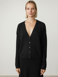 A transseasonal staple, the Abby cardigan is knitted in soft, mid-weight cashmere for year-round wear. The relaxed silhouette is framed by dropped shoulders, a deep v-neck and full-length sleeves, and finished with ribbed trims as a subtle design detail. DETAILS Knit type: Plain Knit Gauge: 12 Weight: 205g Composition: 100% cashmere SIZE GUIDE * European sizing * Designed for a regular fit * The model is 180 cm/5’11” tall and wears a size 1 Our sizes: 0: XS 1: S-M 2: M-L Abby's measurements: Size 0: * Body length: 52 cm * Chest: 57 cm Size 1: * Body length: 53 cm * Chest: 60 cm Size 2: * Body length: 54 cm * Chest: 63 cm