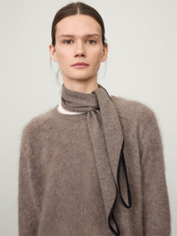 A neat shawl silhouette, the Chelsea scarf is crafted in our signature plain knit cashmere. With its contrast colour trim, it adds a subtle accent to cashmere pieces from across the collection. DETAILS Knit type: Plain Knit Gauge: 12 Weight: 50g Composition: 100% cashmere SIZE GUIDE The Chelsea scarf is 115 x 15 cm .