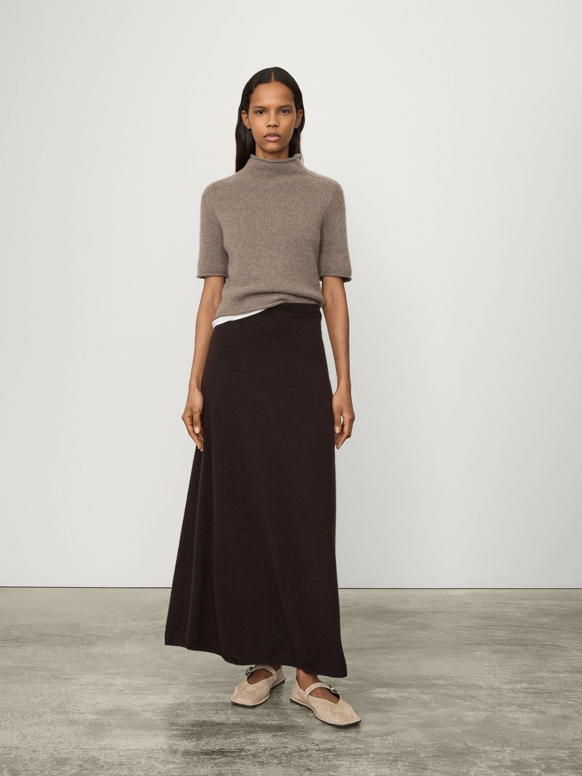 <!--td {border: 1px solid #cccccc;}br {mso-data-placement:same-cell;}--> <!--td {border: 1px solid #cccccc;}br {mso-data-placement:same-cell;}--> A maxi skirt with generous proportions, the Dolly skirt is crafted in soft, mid-weight cashmere for transeasonal wear. The relaxed, seamless design sits comfortably at the waist with an elasticated waistband, and falls into a graceful A-line silhouette. A two-in-one design, Dolly can also be worn as a sleeveless bandeau dress. DETAILS Knit type: Plain Knit Gauge: 12 Weight: 265g Composition: 100% organic cashmere SIZE GUIDE * European sizing * Designed for a regular fit * The model is 176 cm/5’9” tall and wears a size 1 Our sizes: 0: XS 1: S-M 2: M-L