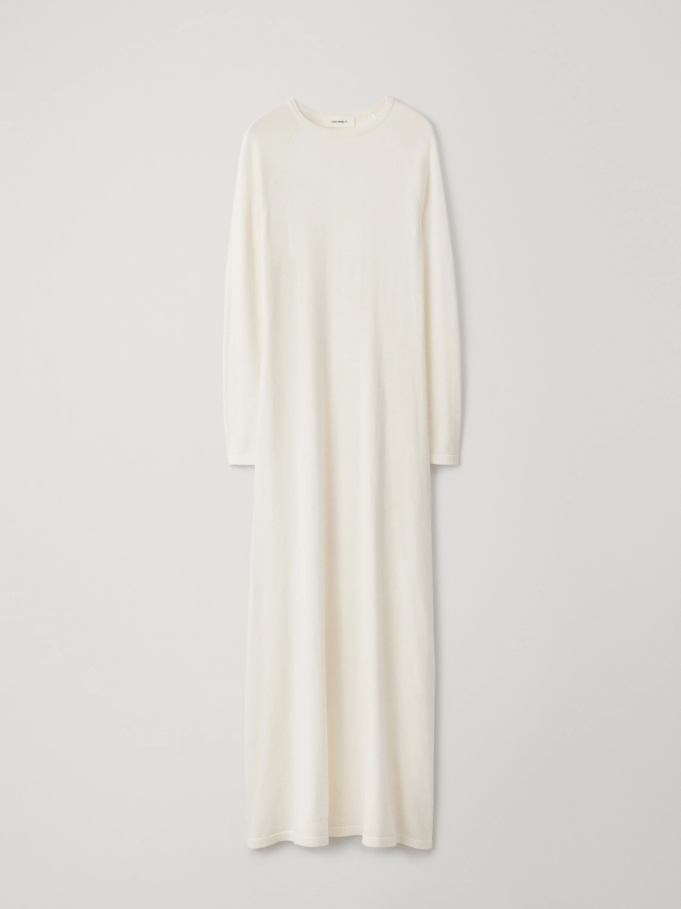 A dress with maxi proportions, the Eliora dress is crafted in our fine knit cotton cashmere composition suggestive of jersey. The regular fit piece skims the body in a slightly A-line silhouette that feels both light and enveloping, and features a crew neck, full raglan sleeves and a floor-gracing skirt with ribbed trims. DETAILS Knit type: Cotton Cashmere Gauge: 16 Weight: 320g Composition: 70% cotton, 30% cashmere SIZE GUIDE * European sizing * Designed for a regular fit * The model is 177 cm/5’9.5” tall and wears a size 1 Our sizes: Size 0: XS Size 1: S-M Size 2: M-L