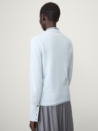 A new seasonal silhouette, the Nellia cardigan is crafted in mid-weight, plain knit cashmere to a feminine expression. The regular fit, straight silhouette features a round neck, a front button closure and full-length sleeves, with buttoned cuffs and inside-out seam details to punctuate the look. Style it with Kenza T-shirt for the intended twinset look. DETAILS Knit type: Plain Knit Gauge: 12 Weight: 235g Composition: 100% cashmere SIZE GUIDE * European sizing * Designed for a regular fit * The model is 177 cm/5’9.5” tall and wears a size 1 Our Sizes: Size 0: XS Size 1: S-M Size 2: M-L
