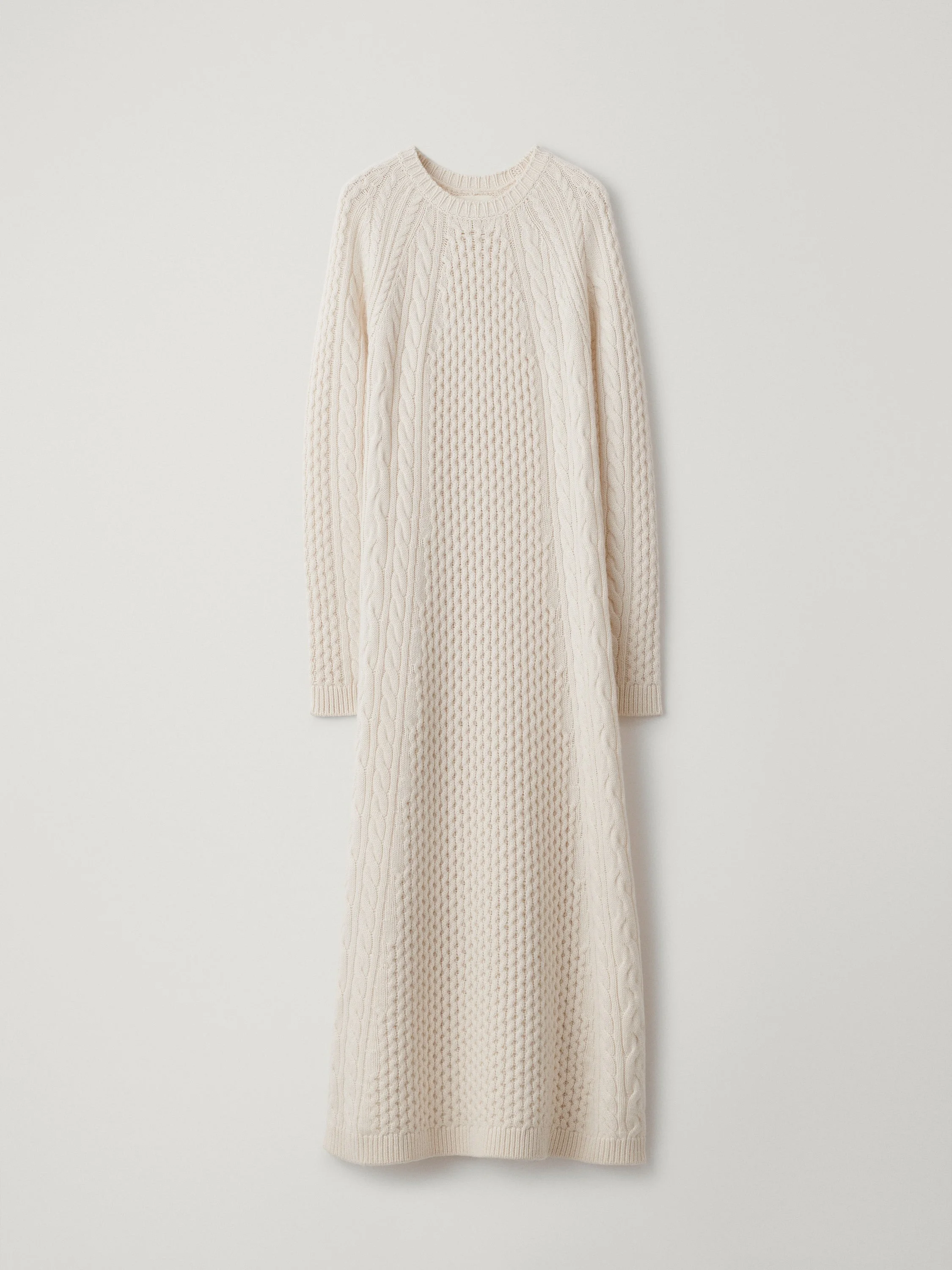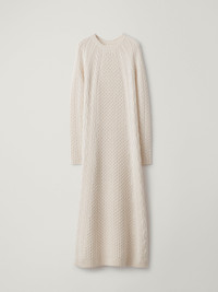 A defining piece of the capsule, the Nyla dress is crafted in chunky knit cashmere with intricate patterns of contrasting cable textures. The regular fit, slightly flared silhouette features a crew neck, full-length raglan sleeves and ribbed trims throughout. DETAILS Knit type: Cable Knit Gauge: 5 Weight: 940g Composition: 100% cashmere SIZE GUIDE * European sizing * Designed for a regular fit * The model is 180 cm/5’11” tall and wears a size 1 Our sizes: Size 0: XS Size 1: S-M Size 2: M-L