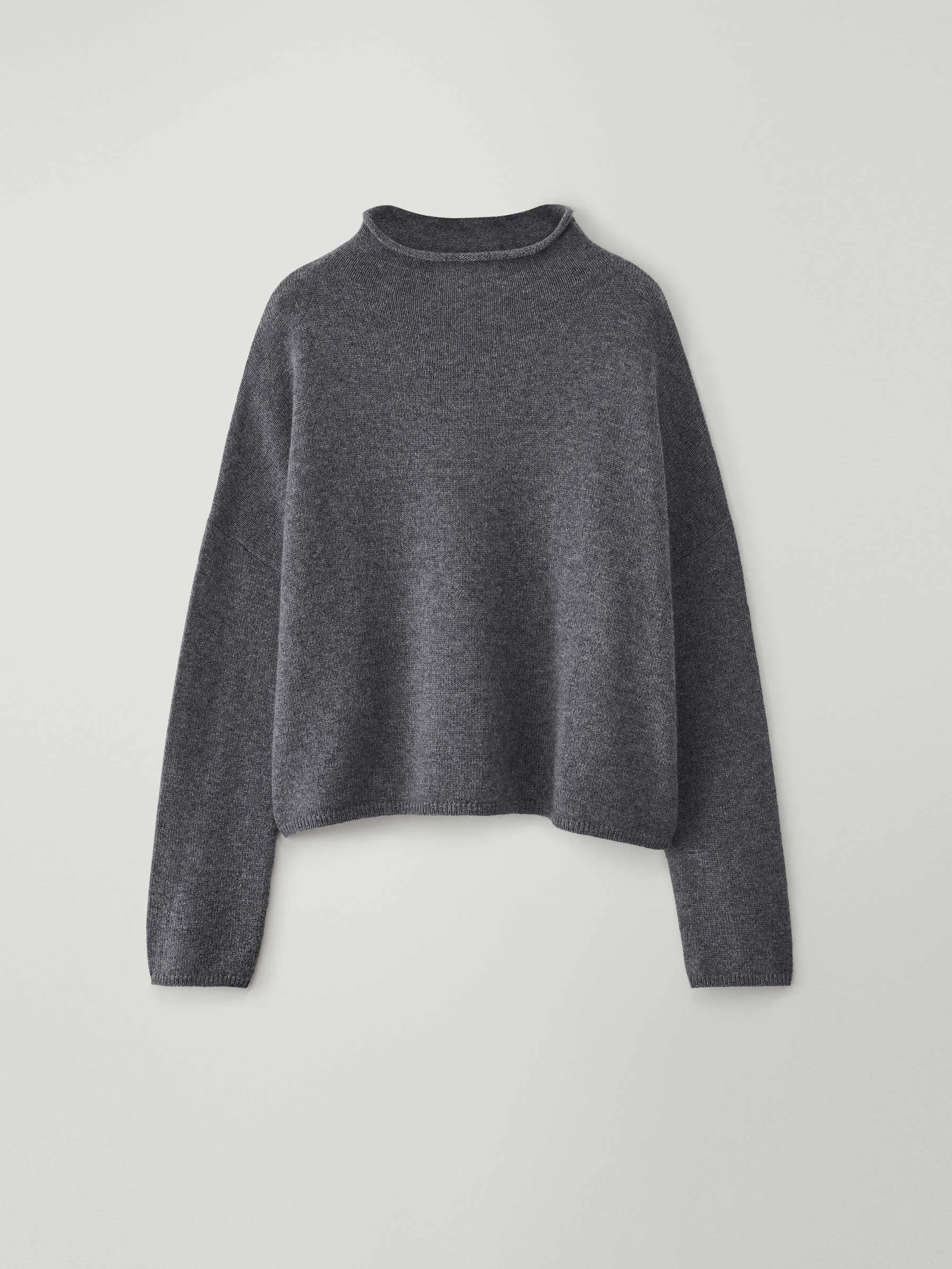 A plush top layer, the Sandy sweater is crafted in rich, heavy knit cashmere to wide proportions. The enveloping silhouette creates effortless drapes at the front and back, made sublime by the generous rolled mock neck and relaxed dropped shoulders. DETAILS Knit type: Plain Knit Gauge: 7 Weight: 280g Composition: 100% organic cashmere SIZE GUIDE * European sizing * Designed for a regular fit * The model is 178 cm/5'10" tall and wears a size 1 Our sizes: Size 0: XS Size 1: S-M Size 2: M-L Sandy's measurements: Size 0: * Body length: 51 cm * Chest: 66 cm Size 1: * Body length: 53 cm * Chest: 68 cm Size 2: * Body length: 55 cm * Chest: 71 cm